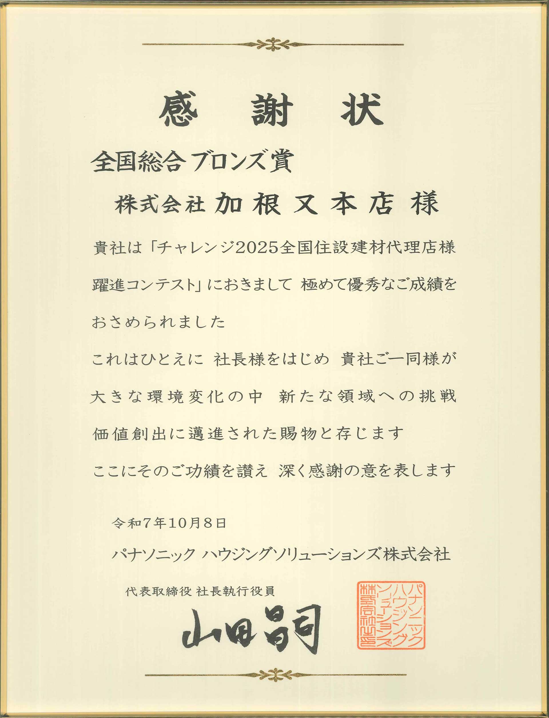 パナソニック ハウジングソリューションズ㈱様より感謝状をいただきました。